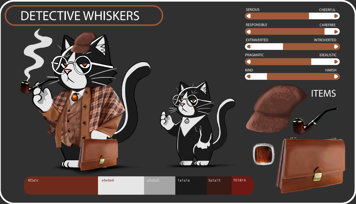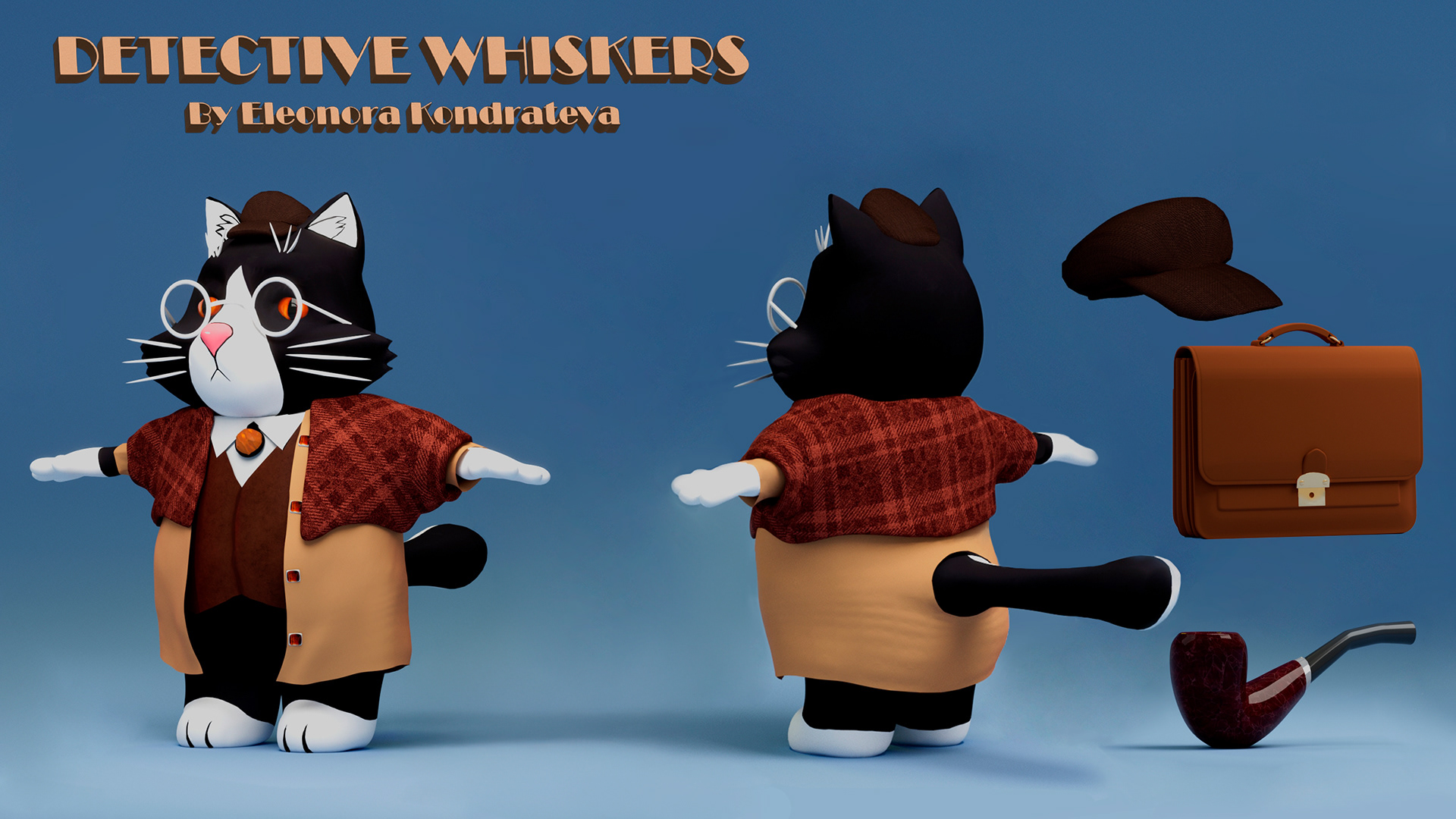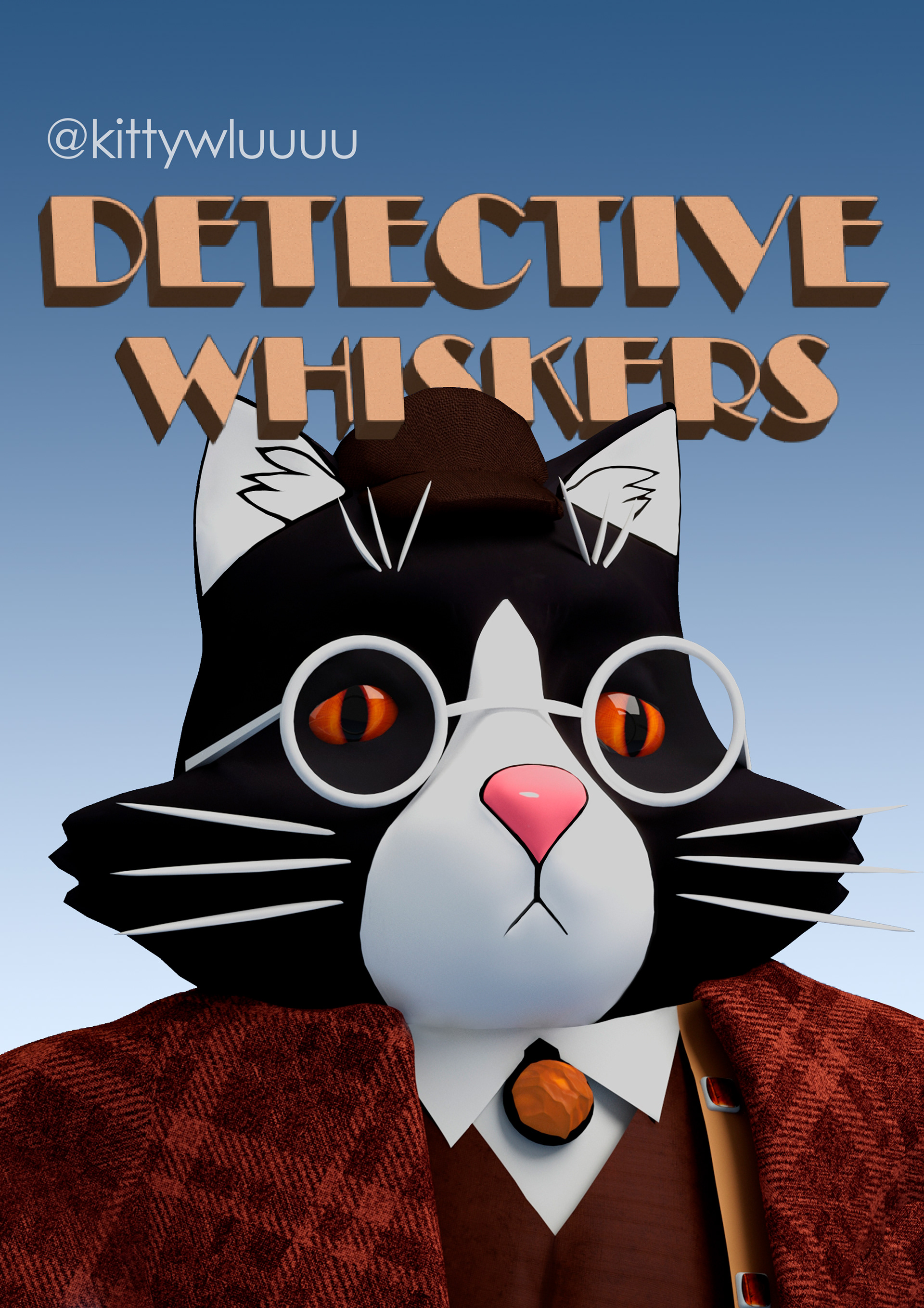 "Detective Whiskers" is a 3D project that focuses on creating assets, 3D character design, and animation. My goal is to show the character in his suit and his story, and also to convey the vibe of flying in an airplane during sunset.