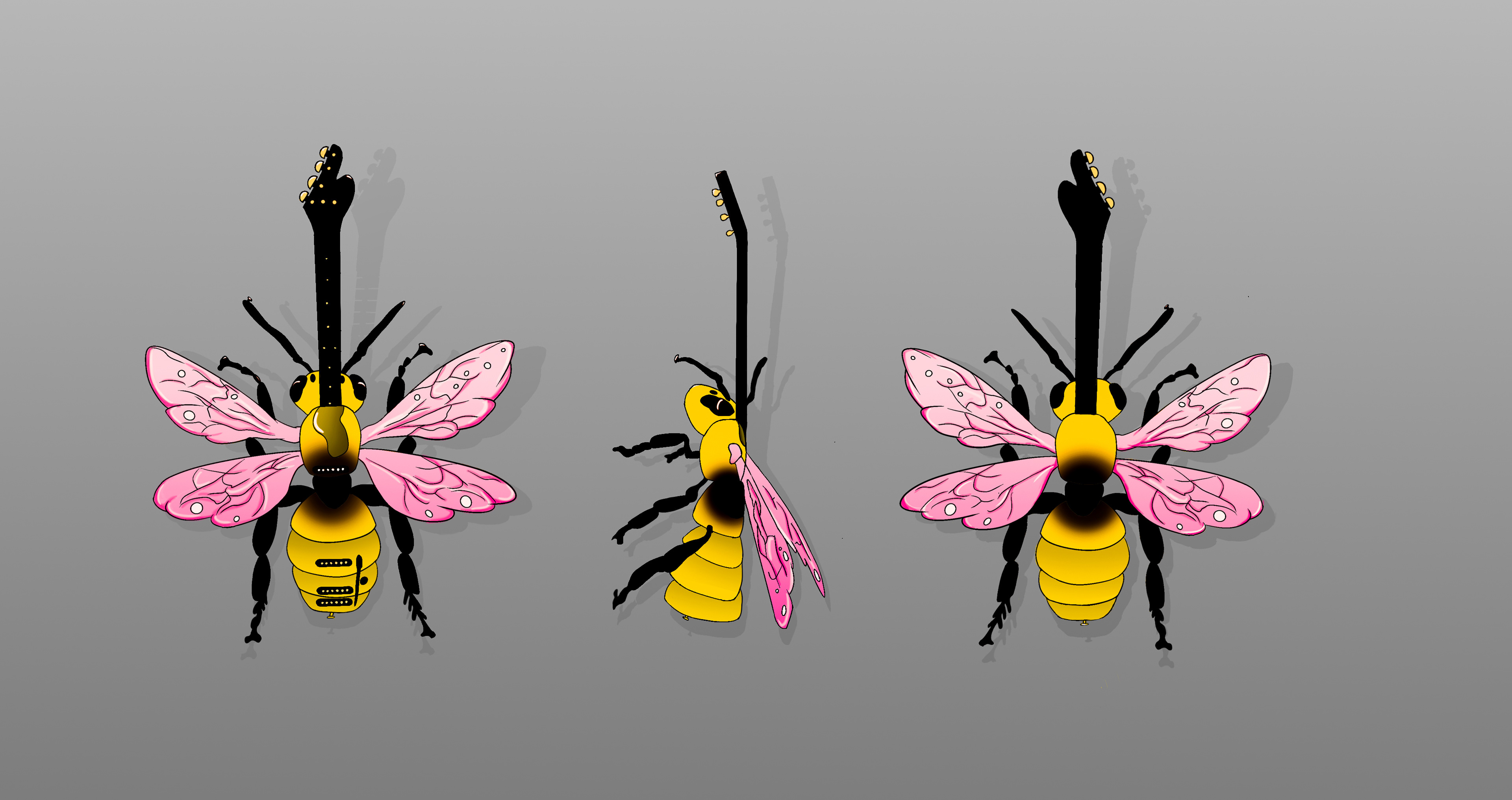 The first asset I created for this project was the main character’s guitar. I decided to focus on an unusual shape and designed a concept for a guitar inspired by the form of a bee. The process began with concept art.